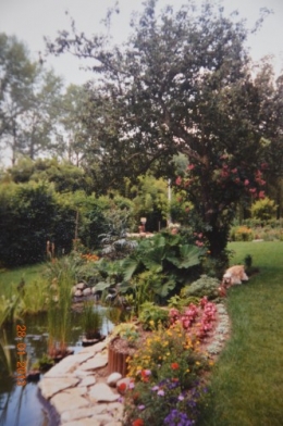 Dans le jardin à Lalinde ,j'ai démaré les plantations en 1999,mon premier rosier fut celui du pommier,un rosier liane planté près du tronc....c'était "Américan Pillar"derrière le bassin